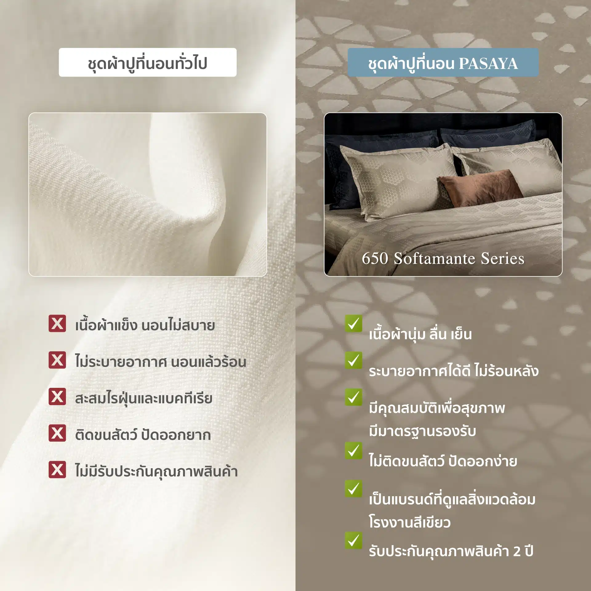 เนื้อผ้านุ่ม ลื่น เย็น ระบายอากาศได้ดี ไม่ร้อน มีคุณสมบัติเพื่อสุขภาพมีมาตรฐานรองรับ ไม่ติดขนสัตว์